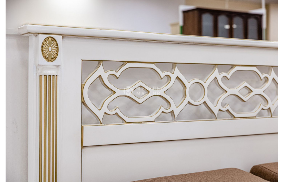 Кровать Пальмира (белая эмаль с золотой патиной) отличается высоким изголовьем, украшенным резьбой, и низким сплошным изножьем. Обе спинки модели плавно переходят в устойчивые ножки, защищающие напольное покрытие. Изделие, которое можно купить по доступной цене в нашем интернет-магазине, сделано из натурального древесного массива.| Размер | Цена | |