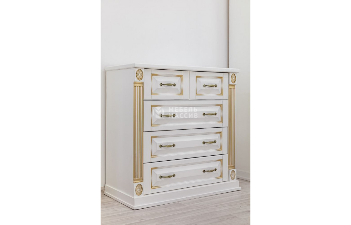 Комод Пальма (белая эмаль с золотой патиной) вдохновлён архитектурой эпохи классицизма, на что указывает стилизованная под античные колонны резьба. изделие имеет устойчивое основание и 5 выдвижных ящиков (3 больших и 2 средних). купив его в интернет-магазине по выгодной цене, вы сможете облагородить интерьер любого помещения.| Размер | Цена | |