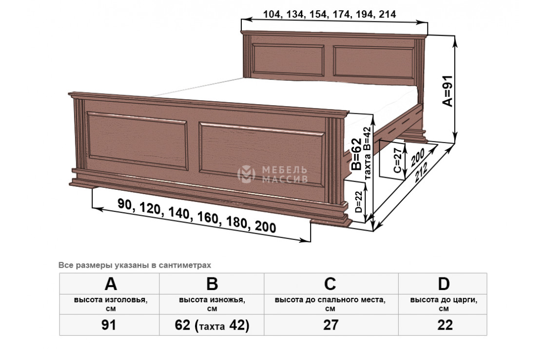 Для основательной конструкции кровати Венеция был выбран безупречный материал – натуральный древесный массив. Прочные изножье и изголовье доходят до самого пола, несколько расширяясь книзу и перетекая в устойчивые ножки. В интернет-магазине можно купить эту надёжную модель по самой выгодной цене. Осуществляется доставка на дом по Симферополю и Республике Крым.| Размер | Цена | |