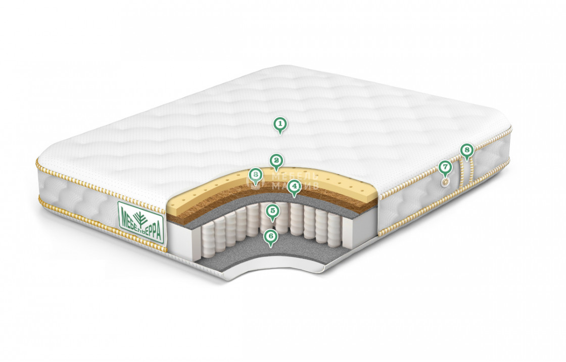6. Кокос 3 см ? Кокос - переплетенные волокна кокосового ореха, растительного происхождения. Исключительные свойства кокоса в прочности, упругости и гигиеничности. Материал придает жесткости матрасу. Обладает отличной вентилируемостью, устойчив к любой влажности и перепадам температуры, гипоаллергенный и долговечный.