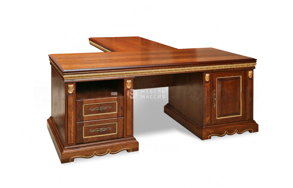 Стол руководителя из серии Милано станет важным атрибутом кабинета начальника, также он подойдет для оформления домашнего рабочего места. Модель имеет Т-образную форму и массивную столешницу, за которой будет комфортно чувствовать себя как сам босс, но и его коллеги либо клиенты. Функциональности столу добавляют боковые тумбы, одна из которых имеет отделение с распашной дверцей, а вторая – открытую нишу и два выдвижных ящика. Изготовлена модель из цельного массива дерева, фасады украшены резными элементами, придающими мебели премиальности. Доставка по Симферополю и Республике Крым.| Размер | Цена | |